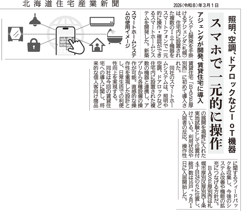 株式会社アジェンダは、株式会社北海道住宅産業新聞社が発行する新聞「北海道住宅産業新聞」において、当社開発のスマートホームシステムが紹介されたことをお知らせします。