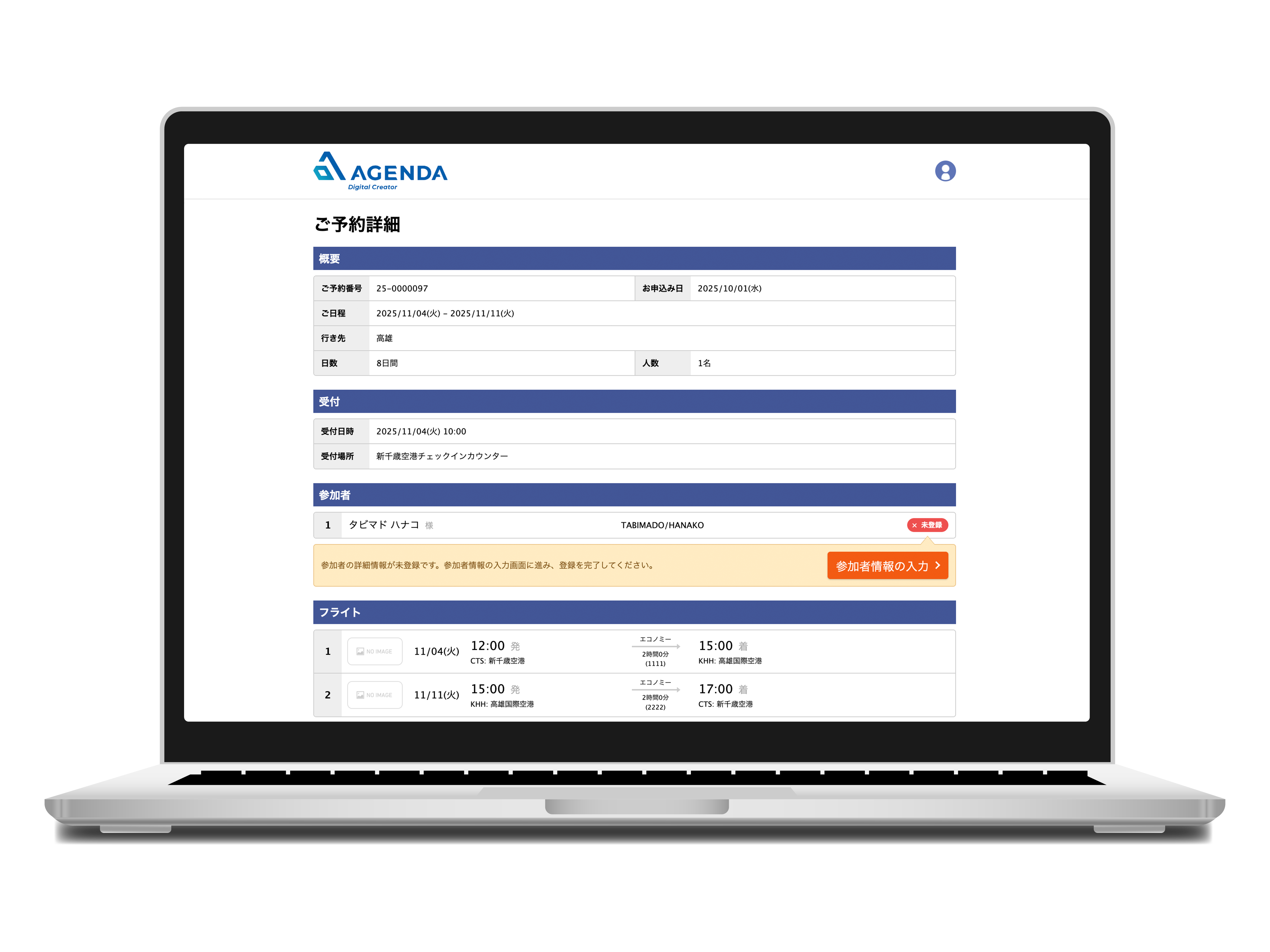 アジェンダが30年以上にわたって積み上げた旅行業に関するノウハウを活かして、旅行業務における使いやすさを突き詰めたUI・UXを独自に開発しました。マタタビ Suiteの「手配情報画面」のUIは、現在意匠登録済みです(※)